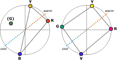 identifying complementary hues (top) using the traditional primary triad (left) requires insertion of secondary hues (right); (bottom) using the modern opponent dimensions We start with the primary triad (C, Y and M), centered on the achromatic mixture (K) of all three primaries in equal proportions at equal tinting strength. We have created the most saturated possible yellow orange mixture from some quantity of yellow and magenta paint (y,m). What then is its visual or mixing complementary color (C(y,m))? Since any two complementary colors must mix to gray, the answer is simply to subtract the primary quantities in y,m from the c,y,m quantities in the achromatic mixture. To do that, we only have to make the larger of the two quantities in the y,m mixture equal to its quantity in the gray mixture. Thus, if we know that: K = 20(C) + 33(Y) + 27(M) then we standardize the larger quantity (60 parts of yellow) on the matching achromatic quantity (33 parts of yellow): 33/60 = 0.55 we adjust the y,m proportions by that amount: 0.55*[60(Y) + 40(M)] = 33(Y) + 22(M) and finally subtract those quantities from the achromatic quantities to get the complementary mixture C(y,m): C(y,m) = (20-0)(C) + (33-33)(Y) + (27-22)(M) Now, although Ogden Rood showed artists how to make similar calculations within a visual color triangle using mixture quantities from a color top, I believe very few artists ever found their complementary paint mixtures by this kind of calculation! That is because Moses Harris mooted the problem when he inserted the secondary or "compound" colors, the complements to the primary colors, in his color wheel. Now we are no longer working within a triangle but a circle, and the complement of the mixture y,o is the mixture v,c in the same relative proportions. And Harris explained that this is how his color wheel should be used "if a contrast is wanting to any color or teint". The complementary colors get us out of the calculations: we judge colors visually instead. Modern color theory goes one step further. It replaces the traditional primary/secondary framework with two opponent color dimensions, defined as visual hue relationships: violet red/blue green (a+/a) and yellow/blue violet (b+/b). These, along with a lightness/brightness (J/Q) or white/black (W/K) dimension, are the modern primaries, descended by a long and indirect path from ideas first proposed by Evald Hering. They are more commonly known as the artist's primaries, and were the primary colors identified in the days before traditional color theory by painters such as Leonardo da Vinci. In this color definition, the relative quantities of two visual primaries in a color (qy and qr for the y,r or yellow orange mixture) define, to a good approximation, the proportions of yellow and violet red paints of equal tinting strength that will create that hue as a material mixture. And these proportions are simply applied to the opposing primaries (in the example, blue green and blue violet) to mix the complementary hue. However, with a modern artist's color wheel (the CIECAM aCbC plane) even that indirection is not necessary. The hue plane is populated with hue and chroma markers for all important modern pigments used in art materials. click on image for a larger view click here for a full page, printer friendly (Adobe Acrobat PDF) version To print the color wheel, set page orientation Simply by drawing a line from any chosen yellow orange pigment (color) through the "black" center of the color wheel and extending it to the opposite side, the artist locates the closest pigments to the visual complement of the chosen color, and can mix a perfect hue match from any two pigments on opposite sides of the line. Thus, the perfect visual complement of isoindolinone yellow (PY110) is ... cobalt blue (PB28), phthalo blue RS (PB15:1) or prussian [iron] blue (PB27). 31. The a+/a and b+/b opponent dimensions of modern perceptual color spaces are the most effective framework for analyzing complementary color relationships. Consider, as an illustration, how the artist might analyze warm/cool relationships in the color design or color harmony in a painting. The traditional primary triad palette includes a red (R) such as cadmium red (PR108) or alizarin crimson (PR83) that contains more yellow than a violet red, and a blue (B) such as cobalt blue (PB28) or ultramarine blue (PB29) that contains more violet than a green blue. As a result, the primary palette is skewed to one side of the warm/cool dimension between red orange and green blue; yellow (Y) is the only color anchor above the line (diagram, below).
