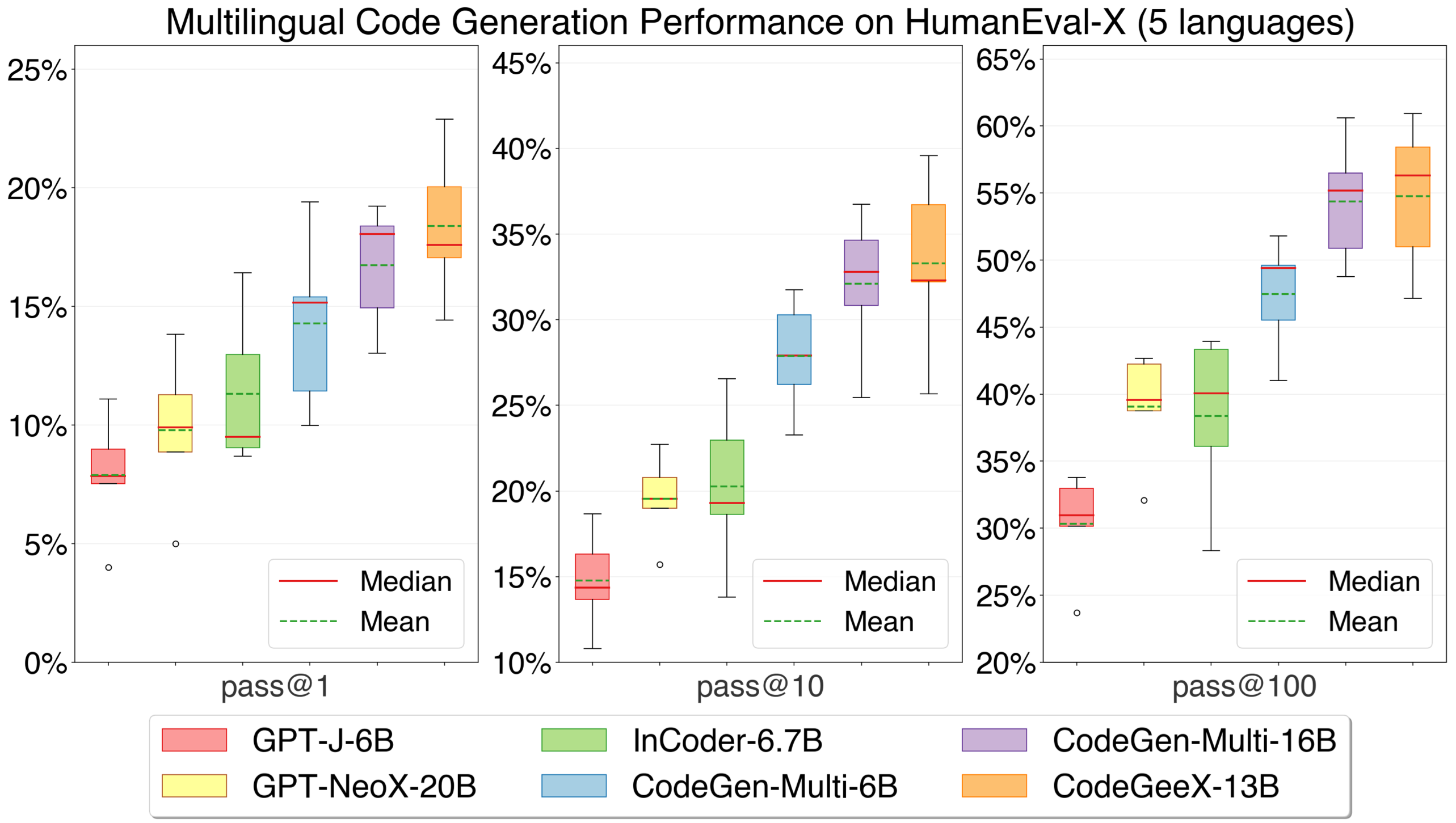 CodeGeeX achieves the highest average performance compared with other open-sourced multilingual baselines.